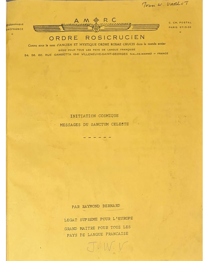 Villeneuve Saint-Georges, AMORC – Ordre ROSICRUCIEN, 14 septembre 1969, tapuscrit in-4, relié demi-basane brune à coins, dos à nerfs, titre doré, 185 pp. Reliure frottée, dernier feuillet froissé avec déchirure restaurée sans manque de texte, traces anciennes d’adhésif.