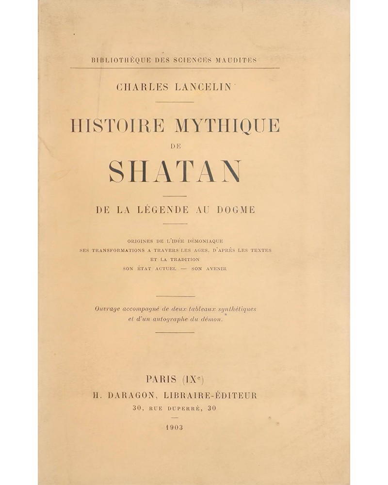 Histoire mythique de Shatan. De la légende au dogme. Origines de l’idée démoniaque, ses transformations à travers les âges, d’après les textes et la tradition. Son état actuel. Son avenir. Ouvrage accompagné de deux tableaux synthétiques et d’un autographe du démon