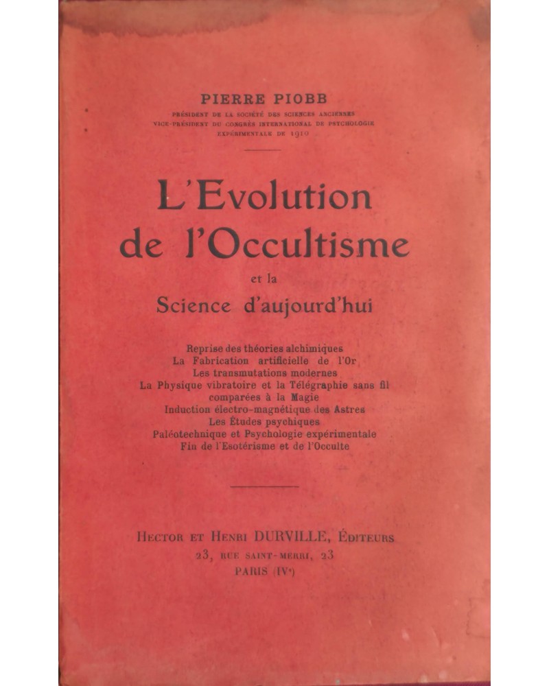 L'Evolution de l'Occultisme et la Science d'aujourd'hui. Reprise des théories alchimiques. La Fabrication artificielle de l'Or. Les transmutations modernes. La Physique vibratoire et la Télégraphie sans fil comparées à la Magie. Induction électro-magnétique des Astres. Les Etudes psychiques. Paléotechnique et Psychologie expérimentale. Fin de l'Esotérisme et de l'Occulte. Rare.