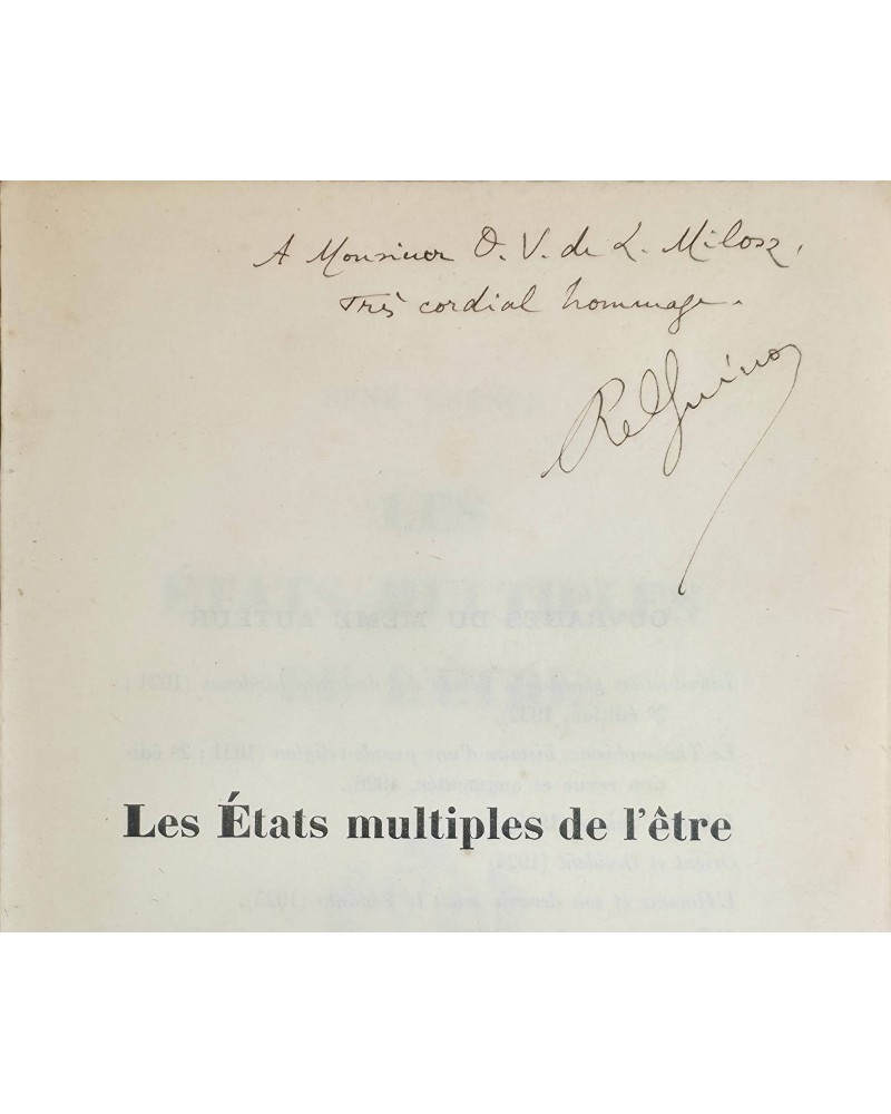 Edition originale. Exemplaire exceptionnel comportant un envoi autographe signé de René Guénon « Monsieur O. V. de L. Milosz. Très cordial hommage ».