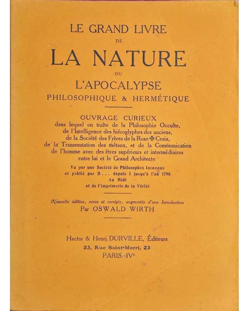 LE GRAND LIVRE DE LA NATURE, ou l'Apocalypse philosophique et hermétique. Ouvrage curieux, dans lequel on traite de la Philosophie Occulte, de l’intelligence des hiéroglyphes des anciens, de la Société des Frères de la Rose + Croix, de la Transmutation des métaux et de la communication de l’homme avec des êtres supérieurs et intermédiaires entre lui et le Grand Architecte. Vu par une Société de Ph :. Inc :. et publié par D.... Depuis I, jusqu’à l'an 1790. Au Midi, et de l’Imprimerie de la Vérité.