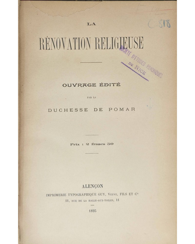 Alençon, Imprimerie typographique Guy, Veuve, Fils et c°, 1895, in-8, demi-percaline verte de l’époque, dos muet, VI, 124 pp. Un manque de papier en marge haute de la page de titre, cachets de la société d’études psychiques de Nice aux pages de titre et de faux-titre ainsi que page 19, notes marginales à la mine de plomb.
