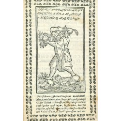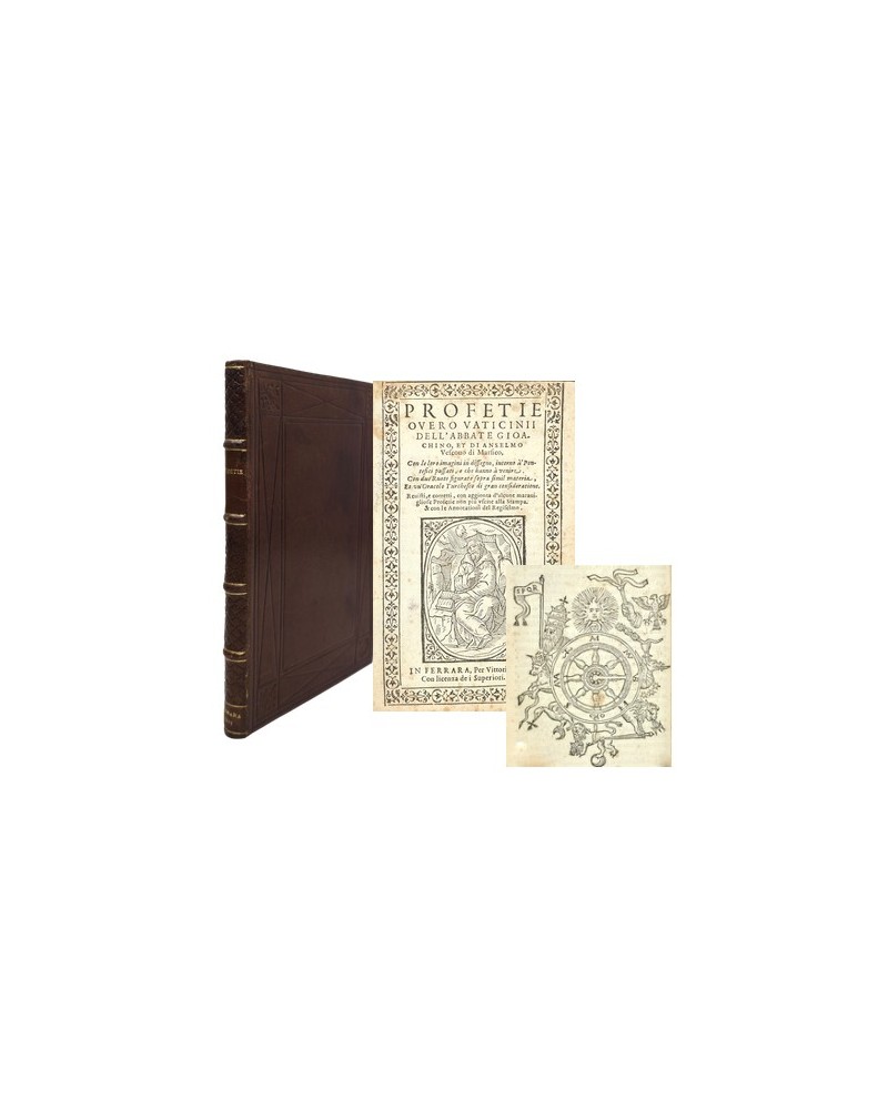 Ferrara, Vittorio Baldini, 1591, in-12, pleine basane XIXe, dos à nerfs, plats ornés de filets à froid, 120 pp. (non paginé). Marges un peu courtes, quelques rousseurs et notes à la plume de l’époque. Edition illustrée de 36 figures gravées sur bois dont une vignette armoriée sur la page de titre (l’une d’elles représentant l’abbé Joachim de Flore dans sa cellule) et de curieux culs-de-lampe également sur bois.