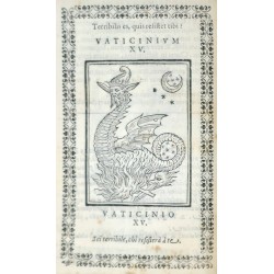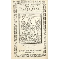 Recueil des célèbres prophéties de Joachim de Flore sur les Papes accompagné de 36 figures sur bois à pleine page (la première édition n’en comprenant que 31), comportant une biographie par le franciscain Gabriele Barrio.