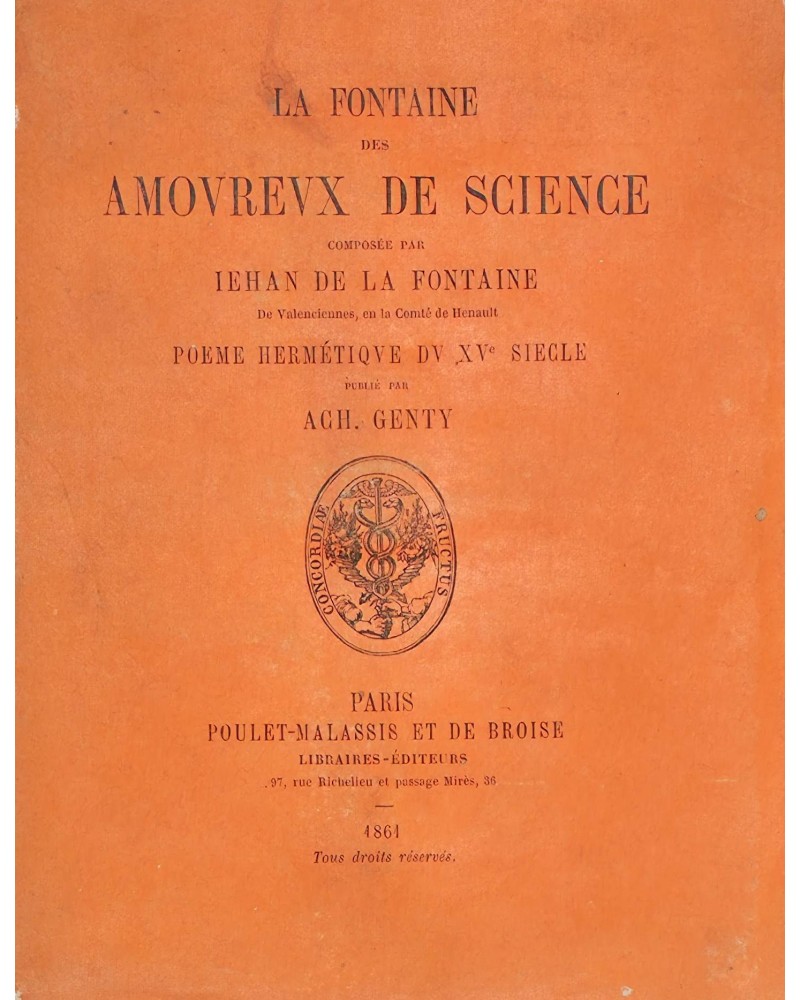 La fontaine des amoureux de science. Composée par Jehan de La Fontaine de Valenciennes, en le Comté de Henault. Poème hermétique du XVe siècle. Publié par Achille Genty