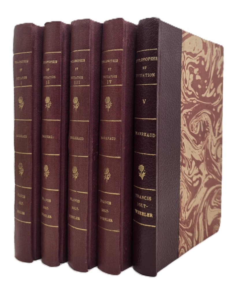 Cours, réalisé à très petit nombre, numéroté 70, comportant la signature de Rolt-Wheeler au bas de la page de titre de chacun des volumes ainsi que, de la même plume, le nom du disciple, Dr André Marréaud (Cours exclusivement adressé au cercle intérieur du groupe d’études). Chacune des pages de titre rédigées de la même plume, encres noire et rouge. Lettrines tout au long du texte, réalisées à la plume, encre rouge.
