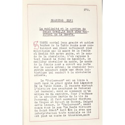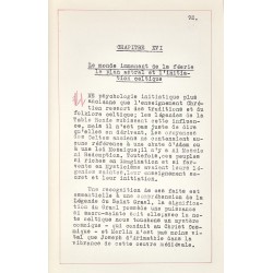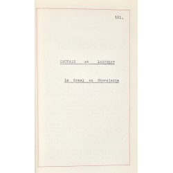Le Saint Graal, la nature de son Mystère Divin, et sa Puissance Initiatique. La nature essentiellement mystique du Saint Graal, sur les différents plans. La Bénédiction de la Coupe à la Saint Cène, la Pâque Juive et l'Eucharistie. La Coupe Cosmique que l'ange porta à Jésus dans le Jardin de Gethsémani. Comment la Coupe Précieuse fut donnée par Ponce Pilate à Joseph d'Arimathie. Le Sang du Christ recueilli dans la Coupe qui devint ensuite le Saint Graal. La Crainte de la Mort envers Jésus, et la libération des âmes dans les enfers. La Captivité de Joseph d'Arimathie, comment il fut nourri par le Graal. La libération de Joseph de la prison, suivant un miracle du Voile de Ste Véronique. Le départ de Joseph pour l'Occident, la Deuxième Table et le Siège Périlleux. La Consécration Pontificale de Josephe II, à Sarras, l’Eglise Celtique. Montségur, Bretagne et Glastonbury ; les voyages des Gardiens du Graal. L'histoire du Roi Evalach, le Roi Méhaigné, sa blessure, son soutien par le Graal. L'odyssée de Nasiens ; l’ile Tournoyante et la Nef Mystique de Salomon. Les Châteaux du Graal, la blessure du Gardien, et les Temps Aventureux. Le monde de la Féerie, le plan astral et l’initiation Celtique. Le complot infernal, la vierge visitée par un démon et la naissance de Merlin. La lutte des dragons, le traître Vortigern, Uther Pendragon, la naissance d’Arthur. Les naissances étranges des héros qui poursuivent la Queste. La mort d’Uther. Arthur tire l’épée de l’enclume devient roi, et reçoit Excalibur de la Châtelaine du Lac. Genièvre de Carmélide, son mariage avec Arthur, le rétablissement de la Table Ronde. La barque enchantée, le combat entre Arthur et Accolon, les deux épées Excalibur. La tragédie de Balyn et Balan. Le coup Douloureux et la mort des deux frères. La vie de Merlin, son amour pour Vivienne et comment il fut tenu prisonnier. La vision du Saint Graal à Camelot, le vœu des Chevaliers de la Table Ronde. L’histoire mystérieuse de Chause, écuyer d’Arthur, qui trouva la mort dans le pays des rêves. La mélancolie d’Arthur, la lutte des démons, et l’aventure dans la forêt Enchantée. La mort de Lohot, la traîtrise de Kéi, les peintures de Lancelot dans le château de Morgane. La mort de la demoiselle d’Ascalot ; Lancelot est trahi et Genièvre est condamnée au bûcher. La félonie de Mordred, la dernière bataille ; le départ d’Arthur pour l’Au-Delà. Les Origines de la Chevalerie, ses rapports avec les légendes de la Table Ronde. L’aventure aux noces du roi, comment Gauvain commença honteusement sa carrière. L'amour de Pelleas, le Chevalier Dolent pour Ettarde la Cruelle, et la trahison de Gauvain. La Demoiselle du Char, et comment Gauvain gagna l'écu de Judas Macchabée. Comment Gauvain occit le géant, et gagna l'épée avec laquelle St. Jean Baptiste fut décapité. la visite de Gauvain au Château du Graal, comment malgré sa prouesse, il fut disgracié et honni. La Nature de l'amour chevaleresque dans les Légendes de la Table Ronde ; Lancelot et Guenièvre. La mort de Ban de Benoïc, l’adoption de Lancelot par la Dame du Lac. Comment la Dame du Lac sauva Lionel et Bohors du roi tyran Claudas. Le symbolisme de la Chevalerie ; comment Lancelot fit ses vœux pour la Reine Guenièvre. L'aventure de la Dame de Nohant, et comment Lancelot recevait son épée des mains de la reine. Le principe de la virginité et le cas de conscience qui poussa Bohors à abandonner son frère. Comment Lancelot fut désapprouvé en commençant la Queste du Graal, et son repentir. Comment la Vision du Saint Graal fut accordée à Lancelot et comment il fut châtié de son intrusion. La mort de Gauvain, de la reine Guenièvre et de Lancelot ; la fin de la Table Ronde. Sa sublimité et le mystère du Saint Graal, le haut plan spirituel de la Queste. Perceval le rustre, comment il devint preux chevalier par des voies étranges. Perceval rencontre Blanchefleur, sa transe d’amour, comment il se vengea de Kéi. La Question Mystique, le silence de Perceval et sa première visite au château du Graal. Comment la soeur de Perceval obtint une pièce du Saint Suaire dans l’Ossuaire Hanté. La défaite du Roi du Château Mortel, comment Perceval sauva les reliques saintes. Comment Perceval vit une chaîne l’or suspendue entre le ciel et les enfers. Les rapports ésotériques entre les Templiers et la Queste du Saint Graal. Comment Galaad reçut l'écu de la Croix, consacré par Joseph d'Arimathie. La libération des captives tenues en prison par les Chevaliers des Sept Péchés. Comment Galaad, Perceval, Bohors, et la soeur de Perceval trouvèrent la Nef de Salomon. Le massacre dans le Château de Carcelois, l’apparition du cerf blanc et des quatre lions. La mort sacrificielle de la soeur de Perceval, et comment elle partit pour son dernier voyage. La guérison du Roi Méhaigné et du Roi Blessé ; la Messe du Graal, la Queste achevée. Le départ pour Sarras, la mort de Galaad et Perceval ; le Retour du Saint Graal.