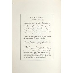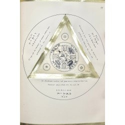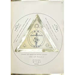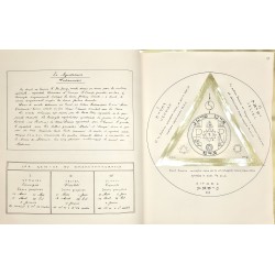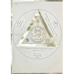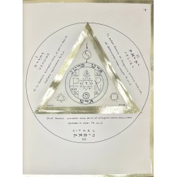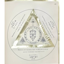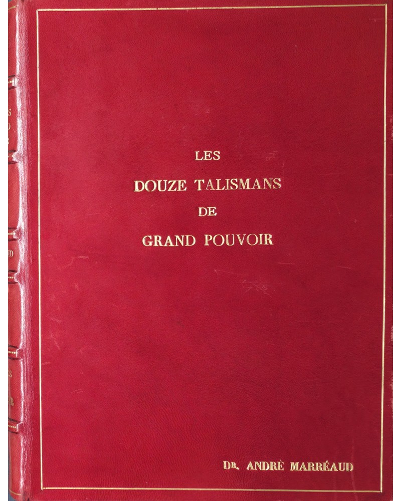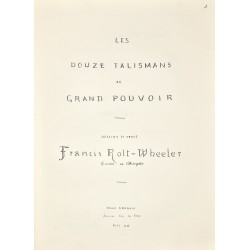 Grand in-4, sans date (vers 1949), réalisé et consacré au Centre Talismanique TRISMEGISTE (Hiereus : Dr Francis Rolt-Wheeler), 132 pages manuscrites, comprenant 24 talismans dessinés à l’encre noire sur parchemin, recto-verso, encadrées de triangles à la feuille d'or (deux talismans par signe du zodiaque), et un cercle tracé à l'encre noire. Chaque planche est encadrée de bordures à la feuille d'or.