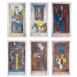 RARISSIME ET SUPERBE Tarot Médiéval original créé par l'artiste Christian LORING et Francis ROLT-WHEELER rehaussé à la main et imprimé en 1940 - 22 Arcanes majeurs + 4 As + 16 cartes de cour (valets, chevaliers, reines et rois), soit 42 cartes. Les cartes de chiffres (2 à 9), de moindre facture du point de vue graphique, sont absentes.
