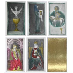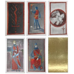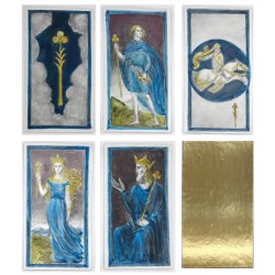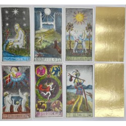 42 cartes sur carton spécial métallisé, 69 mm x 128 mm, toutes rehaussées à la main, feuille d'or fin 24 carats aux dos.