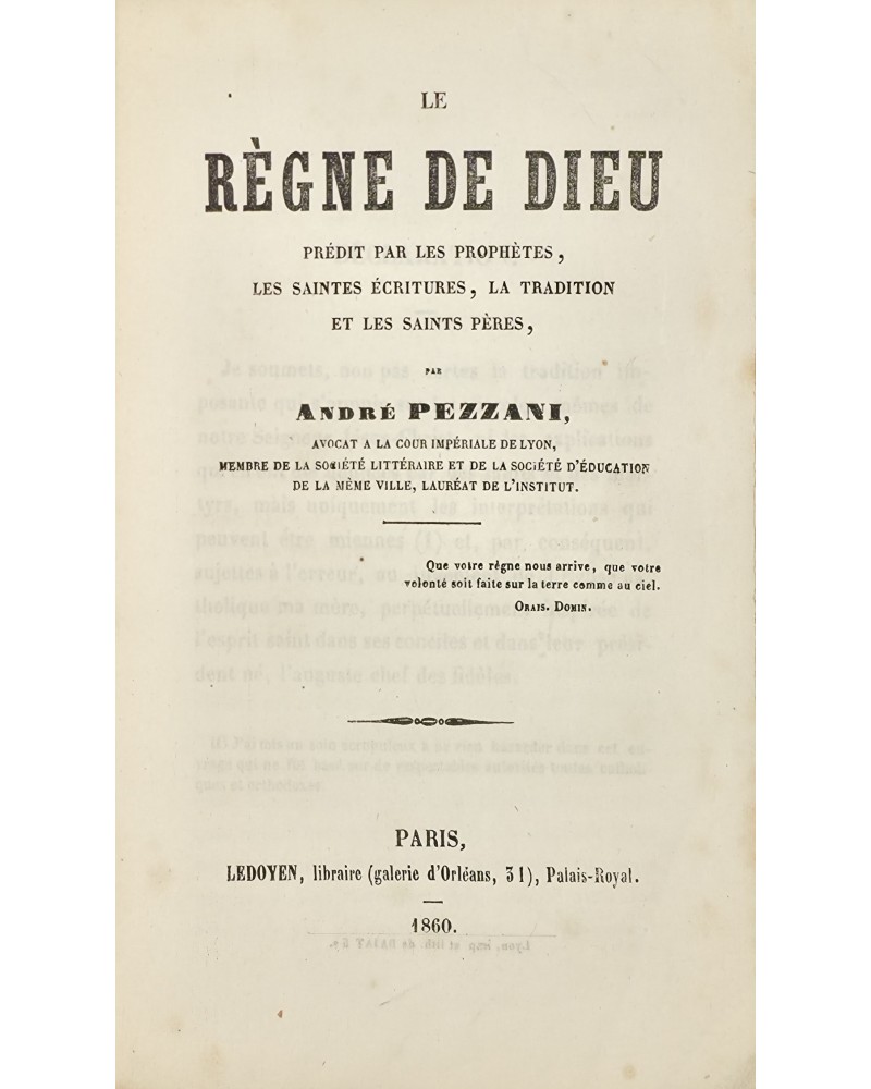 Rarissime publication de l'auteur qui manque à Pierre Dujols et aux autres bibliographies. L'auteur traite d'une question théologique fort controversée, le Règne de Dieu sur terre et le second avènement du Messie. Cette question agite certains milieux de l'Eglise de France en raison du contexte perturbé qui suit la Restauration. C'est ainsi que l'auteur prend soin de se démarquer du baron de Richemont comme de Pierre Michel Vintras sur lequel il parait très renseigné. Il semble par ailleurs faire grand cas de Louis Michel de Figanières et de son livre La Clé de la vie. Articulé en trois parties, l'ouvrage résume dans un premier temps ce qui est abordé dans l'Ecriture Sainte et la tradition apostolique. Il analyse ensuite les points de vue des théologiens modernes et l'auteur conclut avec une intéressante analyse personnelle.