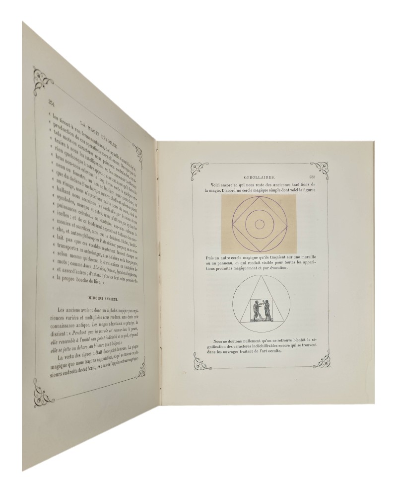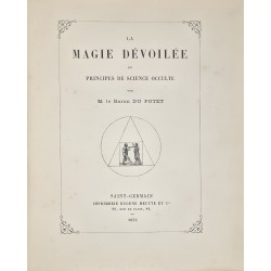 Deuxième tirage, imprimé à très petit nombre d’exemplaires, de cet ouvrage rarissime, conforme à l'édition originale de 1852. Caillet 3405. Dorbon 1387 : « Édition très rare surtout quand elle contient, outre les figures imprimées, dont 12 tirées à part sur 2 feuillets de papier teinté bistre, celles que l’auteur dessinait à la main pour ses disciples… ». Stanislas de Guaita : « Cet ouvrage n’a pas été mis dans le commerce. M. le Baron Du Potet le réservait à ses Initiés, auxquels il le cédait au prix de cent francs l’exemplaire et moyennant le serment par écrit de ne le communiquer à personne et de ne point révéler les secrets qui s'y trouvaient indiqués ». Dujols n° 302, 1909 : « L’ouvrage est précédé d’une intéressante autobiographie de l’auteur. Opérations magiques. Lignes. Miroir, Attraction, Sympathies et antipathies, Flèches, Harmonies magiques, Magique ivresse, Magique vieillesse. L’Agent magique. Principes et secrets. Créations spirituelles. Moyens opératoires. Préparation du miroir. Visions. Préparation. Cercle et miroir visibles et occultes. Domination du destin. Visions virginales. Palingénésie. Les Esprits et leur langue. La mort et ses mystères. Le fruit défendu. Fausse magie. Profanations. Signes et chiffres magiques. Sorcellerie. La réimpression de cet ouvrage est complètement épuisée. »