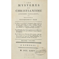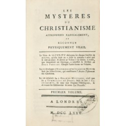 Les mystères du christianisme approfondis radicalement, et reconnus physiquement vrais. Le Nom de la VERITE déclarera sur chaque Feuillet de ce Livre, qu’elle seule en a dicté le contenu à celui qui le met au jour : il devait ce Tribut à sa Gloire. L’ordre que demandait cet Ouvrage, a nécessité sa division en Deux Parties : chaque partie forme un Volume. La 1ere partie développe l’histoire GENESIALE DU MONDE ; Base des Saints Livres qui constituent l’Ancien Testament des Chrétiens. La 2e éclaircit les trois GRANDS MYSTERES ainsi que les quatre EVANGILES DE JESUS ; base de nos 7 SACREMENTS, de tous nos Dogmes Théologaux, & de toutes les Cérémonies de notre Loi Nouvelle