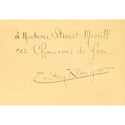 Précieux exemplaire enrichi d’un envoi autographe signé de l’auteur « à Madame Stuart Merrill ces chansons de fou ». Nous laissons à la sagacité des chercheurs l’identification de madame Stuart Merrill.