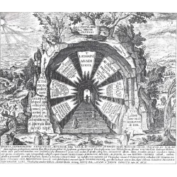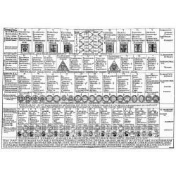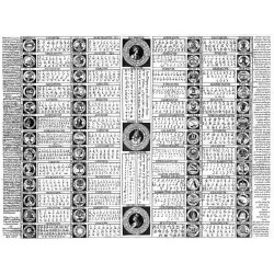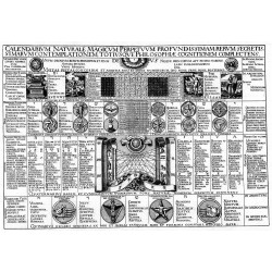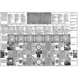 En réalité les 2 premiers tableaux seuls constituent la reproduction en fac-similé de la « Virga aurea » du Fr. Hepburn. Les 3 autres reproduisent une épreuve avant la lettre ou une contrefaçon du « Calendarium naturale magicum perpetuum... » de J. B. Grossschedel von Aïcha, gravé par J. T. de Bry et dont l'inventeur serait Tycho Brahé, en 1582. 2 ex. de l'original gravé portant ces indications existent à la B.N. sous les cotes [R. 5 et [Ge. D. 5082 (Cartes et plans)]. Cf. E. Cazalas, « Mercure de France », du 1er juillet 1939.