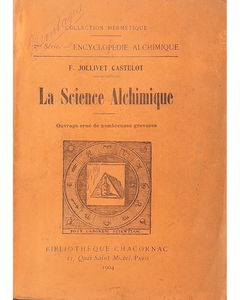 Paris, Bibliothèque Chacornac, 1904, Collection Hermétique, Encyclopédie alchimique, in-8 carré, broché, IV, XX, 360 pp. Illustrations en noir in texte. Couv. lég. défraîchie, dos bruni avec infime restitution de papier au haut, ex-libris à la plume au haut du 1er plat de couv.