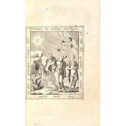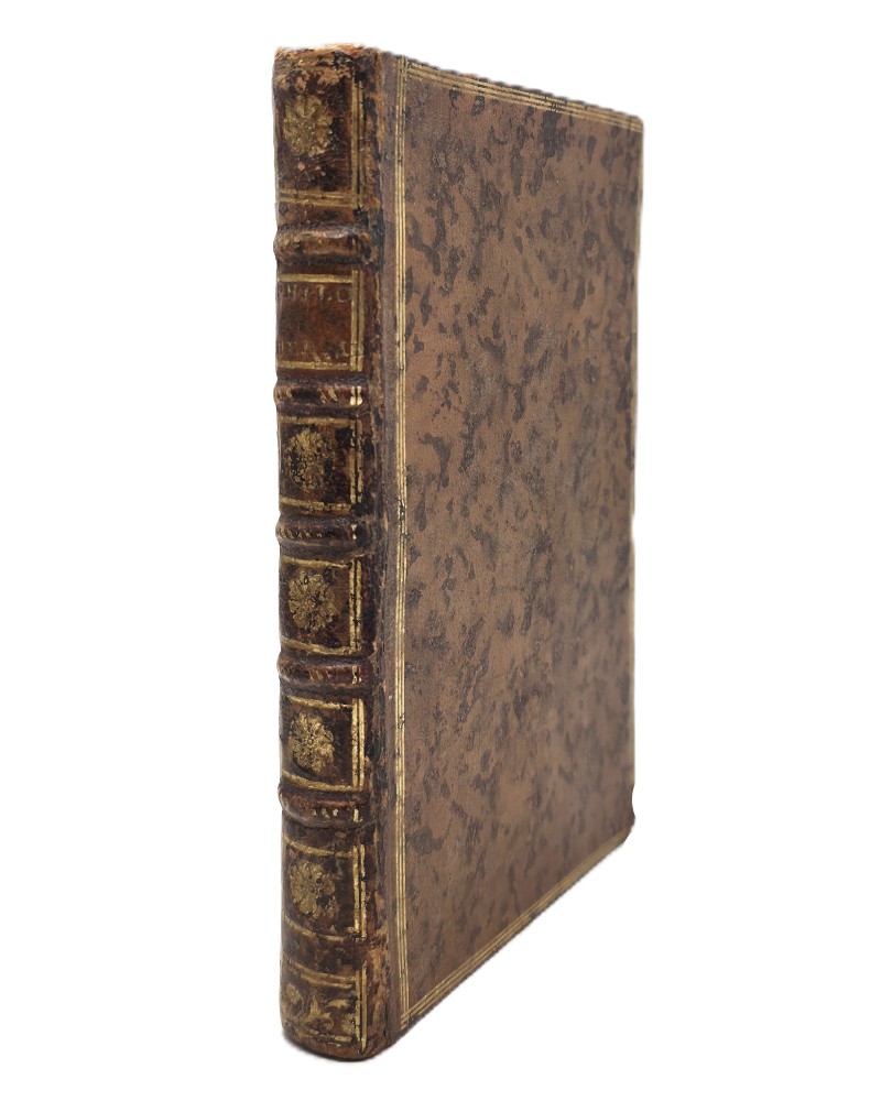 Paris, Charles Hulpeau, 1626, 4 parties en 1 vol. in-8, basane marbrée XVIIIe, dos à nerfs, orné de caissons dorés, triples filets dorés en encadrement des plats, tranches marbrées, VIII, 90 et une vignette gravée ; II, 130 ; (1 f.b. nch) 78 pp. Traces d’usure aux charnières, coins émoussés, pièce de titre lég. frottée. Pour le texte latin rapporté en fin de volume, mouillures claires et fortes rousseurs. Qq rares rousseurs mais bon état pour les autres parties.