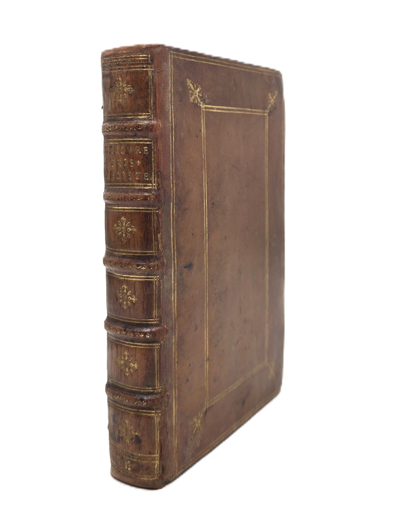 L’ensemble relié en un volume in-8, plein veau glacé, double encadrement de filets dorés sur les plats, petits fleurons dorés aux angles de l'encadrement intérieur, dos à nerfs, orné de filets et fleurons dorés, toutes tranches dorées, 3 ff. blancs, XXIV pp. et 168 feuillets (336 pp.) ; 1 f. blanc., 144 pp. (72 feuillets non chiffrés), 7 ff. blancs. Bandeaux, cul-de-lampe et lettrines. La 1ère page de titre comporte la marque gravée de l’imprimeur. Imprimé en caractères romains avec des manchettes marginales tout au long du premier recueil. Belle vignette gravée sur le titre du second. Très rares rousseurs. Petites taches ff. 74, 97 et 98. Un petit manque angulaire marginal au haut du feuillet g 2. Bel exemplaire dans l’ensemble.