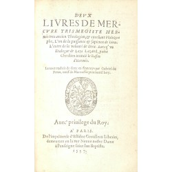 Deux livres de Mercure Trismegiste Hermès, très ancien Théologien, & excellant Philosophe, L'un de la puissance & sapience de Dieu, L'autre de la volonté de Dieu. Avecq'un dialogue de Loys Lazarel, poète Chrétien intitulé Le Bassin d'Hermès. Le tout traduit de grec en françoys par Gabriel du Préau, natif de Marcoussis près Montlhéry
