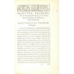 Première traduction établie d’après le texte grec établi par Ange Vergèce (Paris, 1554) pour les Deux livres de Mercure Trismegiste Hermès. Gabriel Dupréau publia toutefois en 1549 une première traduction française de ce recueil, mais d'après la version latine donnée par Marsile Ficin en 1463 (imprimée par Henri Estienne en 1505). La vie de Mercure Trismégiste avec l’argument et contenu du présent œuvre. Les quatorze dialogues du Premier Livre. Les quinze chapitres du second Livre.
