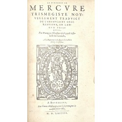 Première édition, tirée à très petit nombre, de la traduction française du célèbre Pimandre d'Hermès par François de Foix de Candalle. Marsile Ficin fit paraître en 1471 sa traduction latine d'une grosse partie du Corpus Hermeticum sous le titre latin Mercurii Trismegisti Pimander seu liber de potestate ac sapientia Dei. L'ouvrage de Ficin est traduit en latin, puis en français en 1574 par François de Foix de Candale sous le titre Le Pimandre de Mercure Trismégiste. Celui-ci regroupe seize petits traités de quelques pages chacun répartis en seize chapitres.