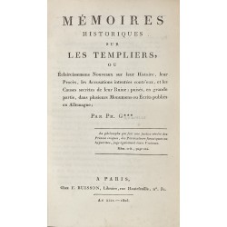 Mémoires historiques sur les templiers, ou éclaircissements nouveaux sur leur histoire, leur procès, les accusations intentées contr'eux, et les causes secrètes de leur ruine ; puisés, en grande partie, dans plusieurs monuments ou écrits publiés en Allemagne par Ph. G*** - Paris, F. Buisson, An XIII (1805)