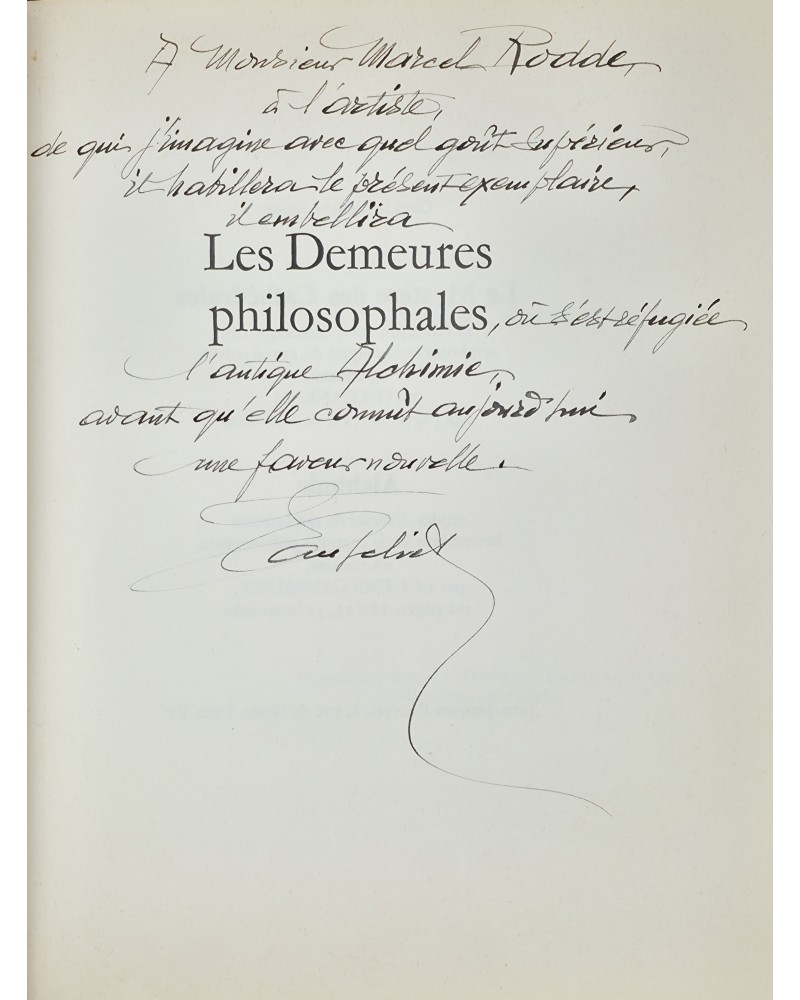 Exemplaire enrichi d‘un envoi autographe signé d’Eugène Canseliet : « A Monsieur Marcel Rodde, à l’artiste, de qui j’imagine avec quel goût supérieur il habillera le présent exemplaire ; il embellira les Demeures philosophales, où s’est réfugiée l’antique Alchimie, avant qu’elle connût aujourd’hui une faveur nouvelle... »