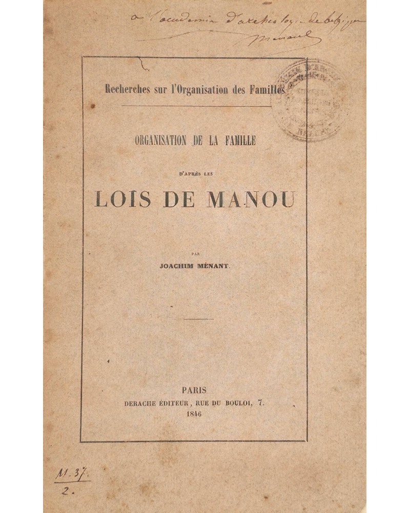 Envoi autographe signé de Joachim Menant à l’Académie d’archéologie de Belgique. Un cachet de cette Académie au haut du titre et du 1er plat de couv.