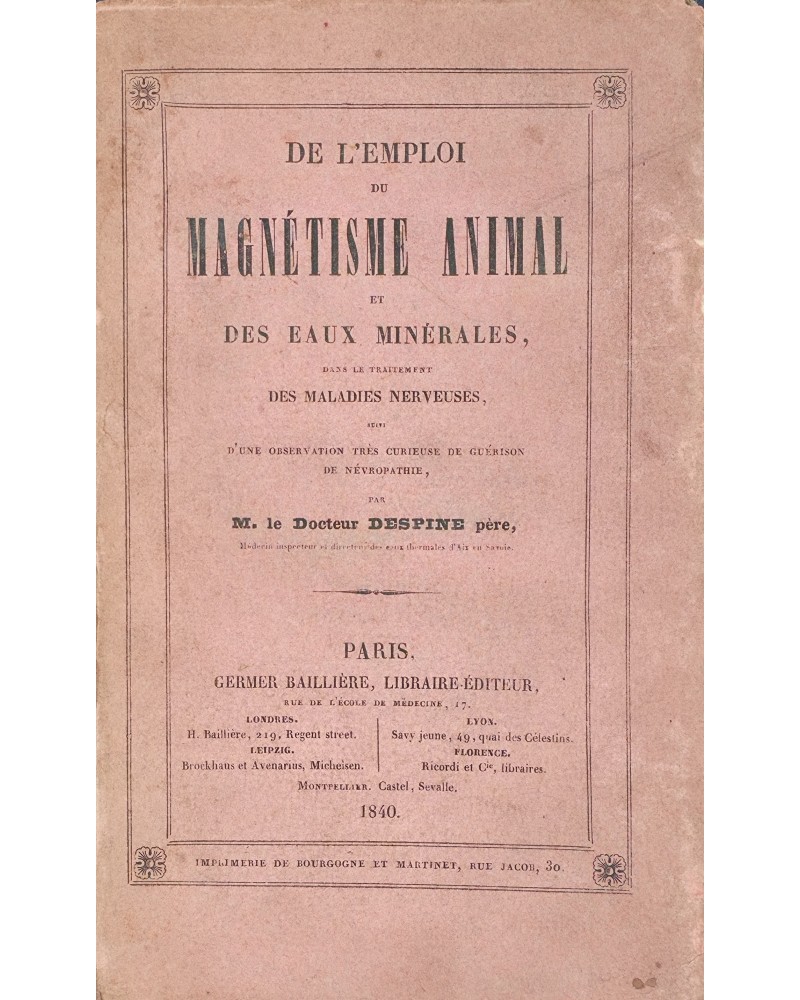 Caillet 3082 (consacre une très longue notice à cet ouvrage) : « L'un des plus intéressants ouvrages qui aient été publiés sur le magnétisme : ce livre renferme les détails d'une des cures les plus remarquables due à ce traitement spécial. Son auteur, le docteur Despine père a pour ainsi dire sacrifié sa fortune à l'étude et à la pratique du magnétisme scientifique, du magnétisme sérieux. etc. etc » En fait, Caillet reproduit ici une analyse précise et tout à fait inédite établie par Alexis Dureau de l'Académie de médecine (Académie dont il fut également le bibliothécaire), grand spécialiste du magnétisme animal et qui anima le journal « L'Union magnétique ». M Dureau rassemblera par la suite une très riche et abondante documentation autour de notre auteur et de ses travaux, ceci en vue de lui consacrer une étude fort approfondie, étude qui malheureusement n'a jamais paru. Il s'agit ici de l'exemplaire de M Dureau qui comporte son ex-libris imprimé. Il se trouve en outre bien complet de son supplément consacré aux eaux minérales d'Aix-en-Savoie, et d'une notice sur les établissements de charité dans cette même localité. Cette importante et fort rare étude ne figure pas dans la Bibliotheca esoterica de Dorbon. Crabtree 421.