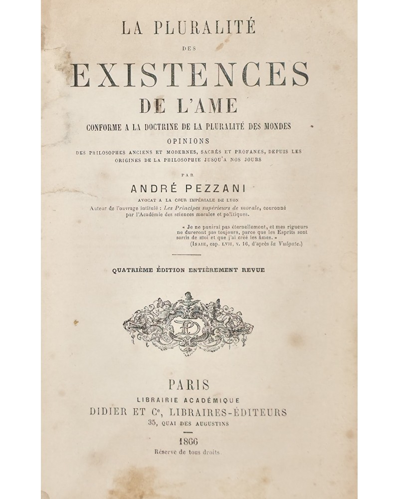 Dujols n° 221, déc. 1912 : « (Très rare et recherché) C'est le livre de chevet des théosophes et le traité le plus complet sur la matière. Pezzani y développe dans toute son ampleur la religion des anciens mystères, la Kabbale, les systèmes de Pythagore et des Druides. Un des côtés attrayants de ce volume est l'exposition des théories de Delormel, dans sa Grande Période aujourd'hui introuvable, et de celles de Dupont de Nemours dans sa Philosophie de l'Univers tout aussi rare. Aucun des écrivains, si ignorés soient-ils, qui ont abordé le sujet, n'est laissé dans l'oubli, ce qui donne à ce livre une allure encyclopédique. » Caillet 8589.