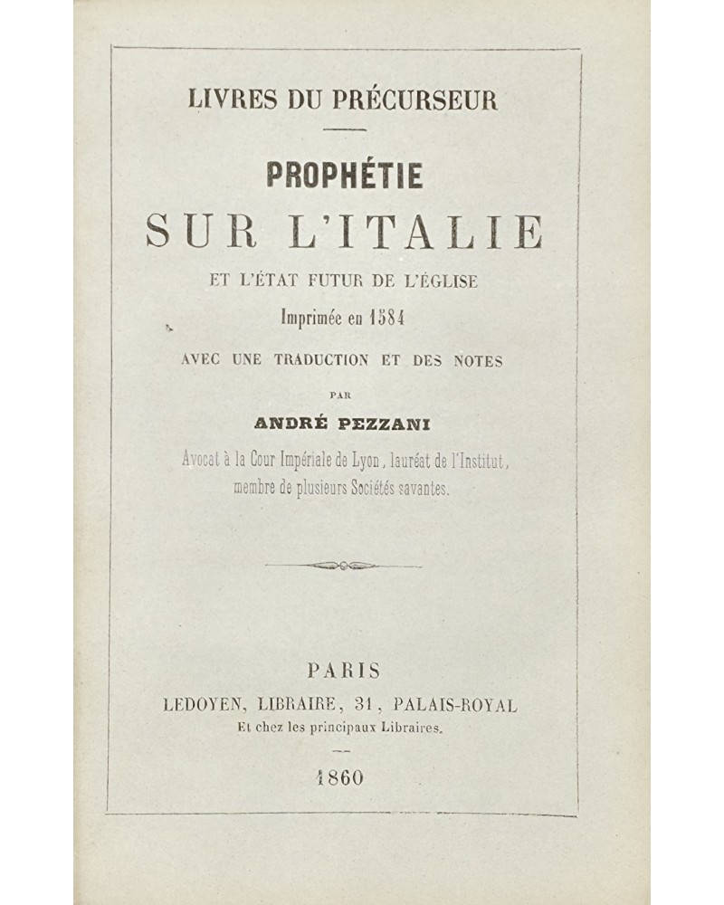 « Nous donnons donc ici au public une prophétie jusqu'à ce jour inconnue, mais qui n'en est pas moins authentique et précise ; elle a été faite, selon le manuscrit du Vatican et l'exemplaire imprimé de 1584, au bienheureux Amadée, évêque de Lausanne, par l'archange Gabriel, qui la lui a révélée. »