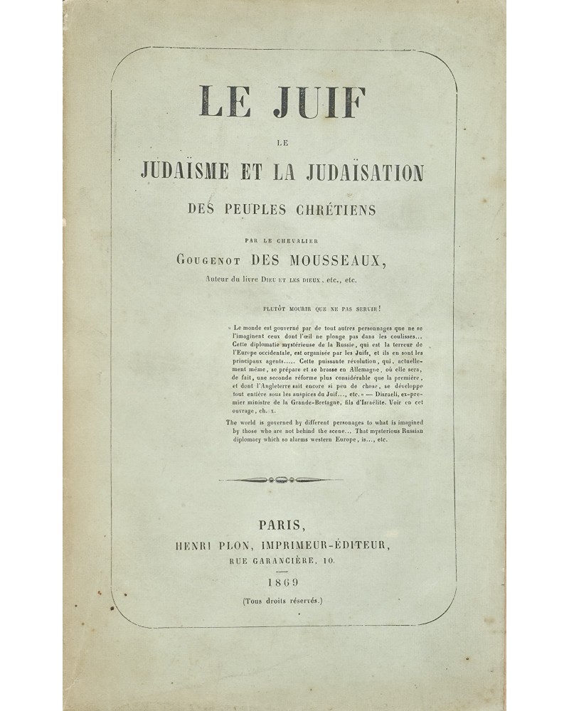 Edition originale. Dujols n°141, juin 1913 : « Le plus rare des ouvrages de Des Mousseaux, et travail colossal sur la matière : Après avoir traité de main de maître l’origine de la tradition juive, ses altérations à travers les temps ; disséqué le Talmud contenant, selon son expression, « la doctrine cabalistique qui est le dogme de la haute magie » ; fouillé profondément les antiquités bibliques et les traditions diverses ; exposé en un mot l’essence de la doctrine judaïque et l’influence des juifs dans le monde, l'auteur consacre une grande partie de son remarquable ouvrage à la Kabbale, qu’il traite également avec une compétence incontestable. En voici d’ailleurs les principales lignes: Traditions orales de la Synagogue antérieure aux livres bibliques. La Kabbale divine, confiée aux docteurs et devenue corrompue. La Kabbale magique, qui donne la connaissance des esprits de ce monde, et gouverne tout être par la vertu des lettres, des mots et des nombres ; elle est la clef du monde invisible, le secret du spiritisme antique. Toutes les religions sont issues de la Kabbale, les associations maçonniques lui doivent leurs secrets et leurs symboles. Le Zohar et le Talmud. Les applications de la Kabbale à la médecine et à l’astrologie. Des Mousseaux était l’ami intime du célèbre Kabbaliste Drach. Cette référence est le meilleur garant des sources où il a puisé. » Caillet 4657.