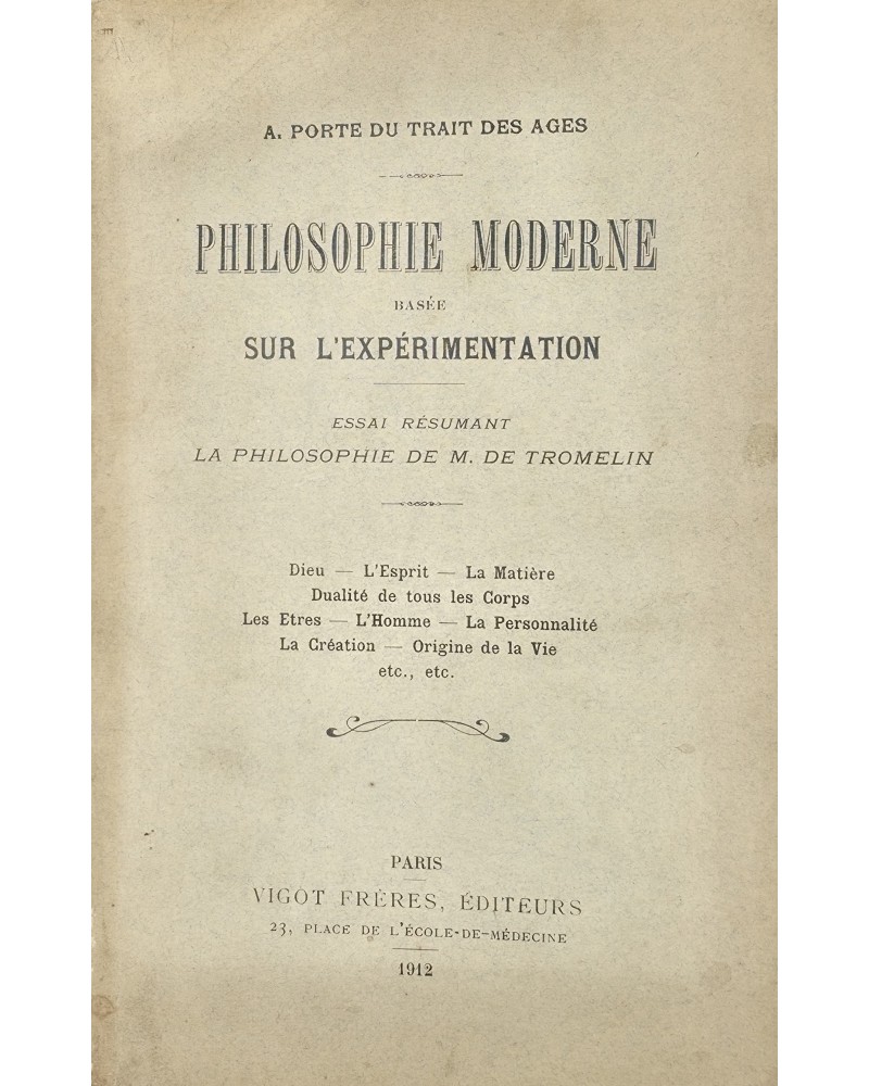 Ouvrage comportant en première partie une préface du Dr Bécour traitant des recherches du Comte Gustave Le Goarant de Tromelin, célèbre, entre autres, pour avoir dessiné l’ex-libris de Papus, dans le domaine de l'occultisme. Celle-ci est précédée d'une autre courte introduction par Fernand Drubay. Ouvrage analysant l'ensemble de la doctrine du Comte de Tromelin, principalement axée sur les phénomènes médiumniques, le monde éthérique, la notion de germes et d'agrégats, de Ka dans la cosmogonie égyptienne. Un chapitre est consacré à Katie King. Rare.