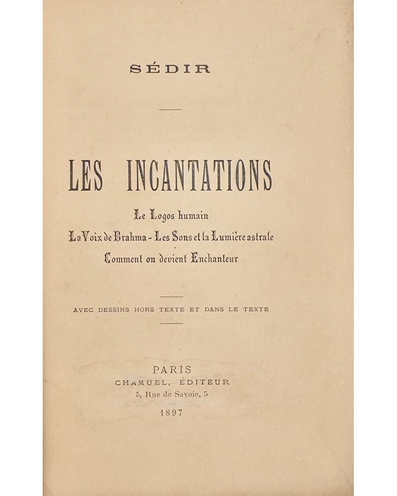 Dujols, cat. III, n° 469 : (rare) Voici le plus important ouvrage du grand occultiste qu'est Sédir. Le sujet abordé par l'auteur est d’un intérêt capital pour tout initié, car on sait que l'Incantation est d'une utilité considérable dans le domaine de la Magie pratique. L’étude des fameux Mantras hindous y est poussée à fond tant au point de vue théorique que pratique. L'auteur relate les expériences les plus curieuses sur les pouvoirs du son que rendent vivantes de nombreuses gravures du plus haut intérêt représentant les images produites dans l'astral par l'action du Verbe.