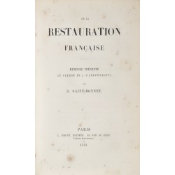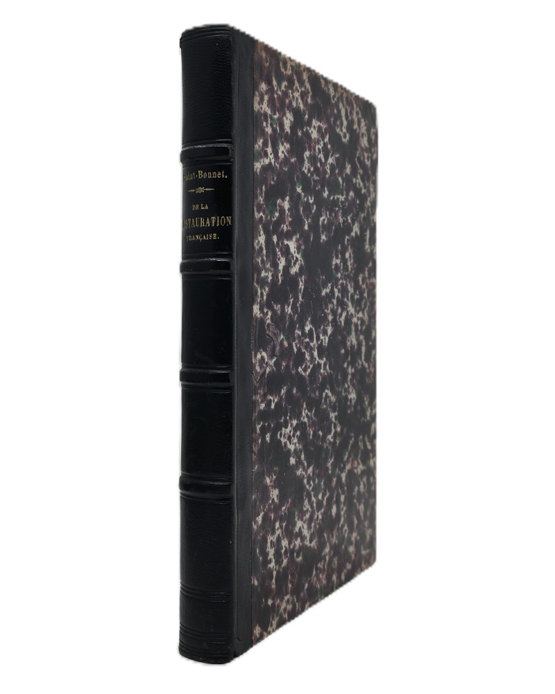 Édition originale de ce manifeste légitimiste écrit en réaction à la révolution de 1848. Blanc de Saint-Bonnet (1815-1880), dont les ouvrages légitimistes et ultramontains exercèrent une influence profonde sur de nombreux écrivains, dont Barbey d'Aurevilly, Bloy, Huysmans. Voir l’exemplaire de Léon Bloy, copieusement annoté, proposé lors de la vente Pierre Bergé et Associés du 28 nov. 2013.